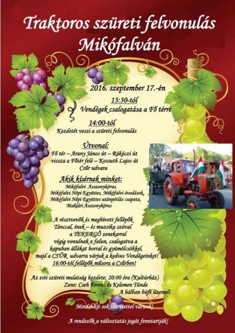 Szeretettel várunk minden kedves résztvevőt 2016. szeptember 17.-én a Mikófalván megrendezésre kerülő Szüreti Felvonulásra!
