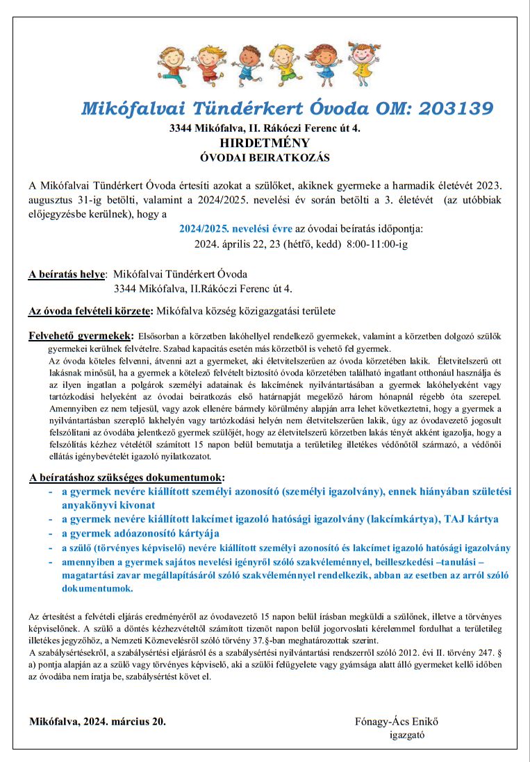 Hirdetmény - Óvodai beiratkozás 2024!